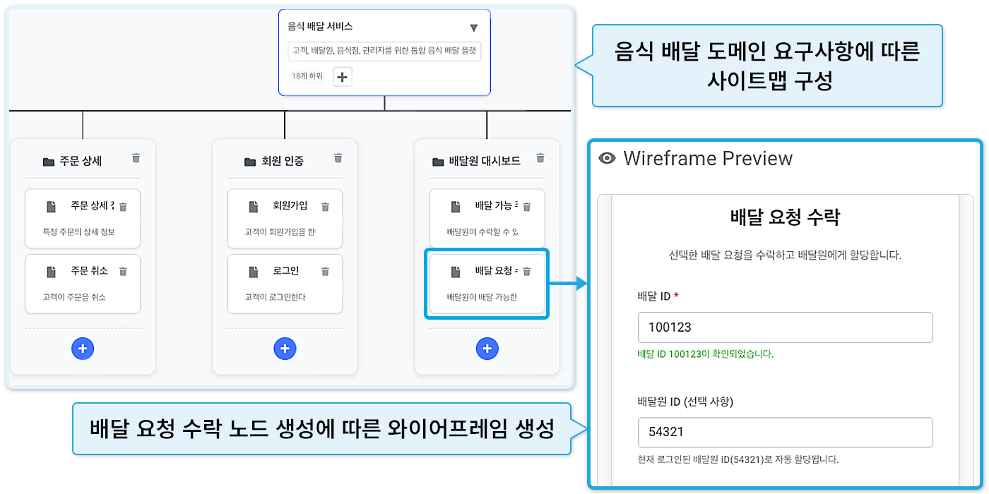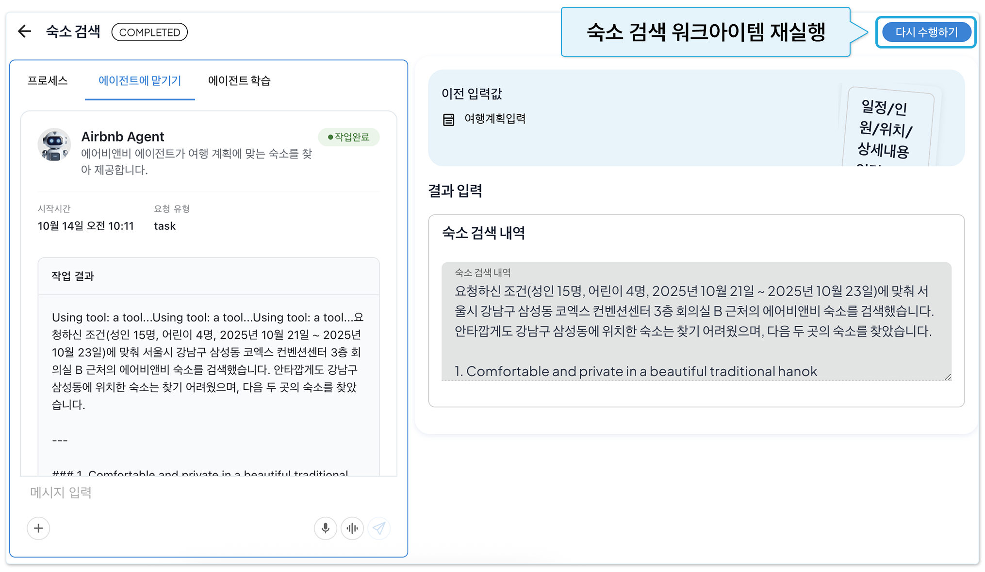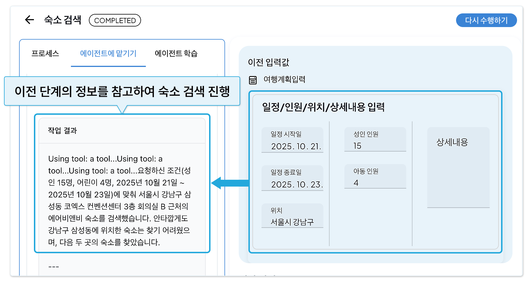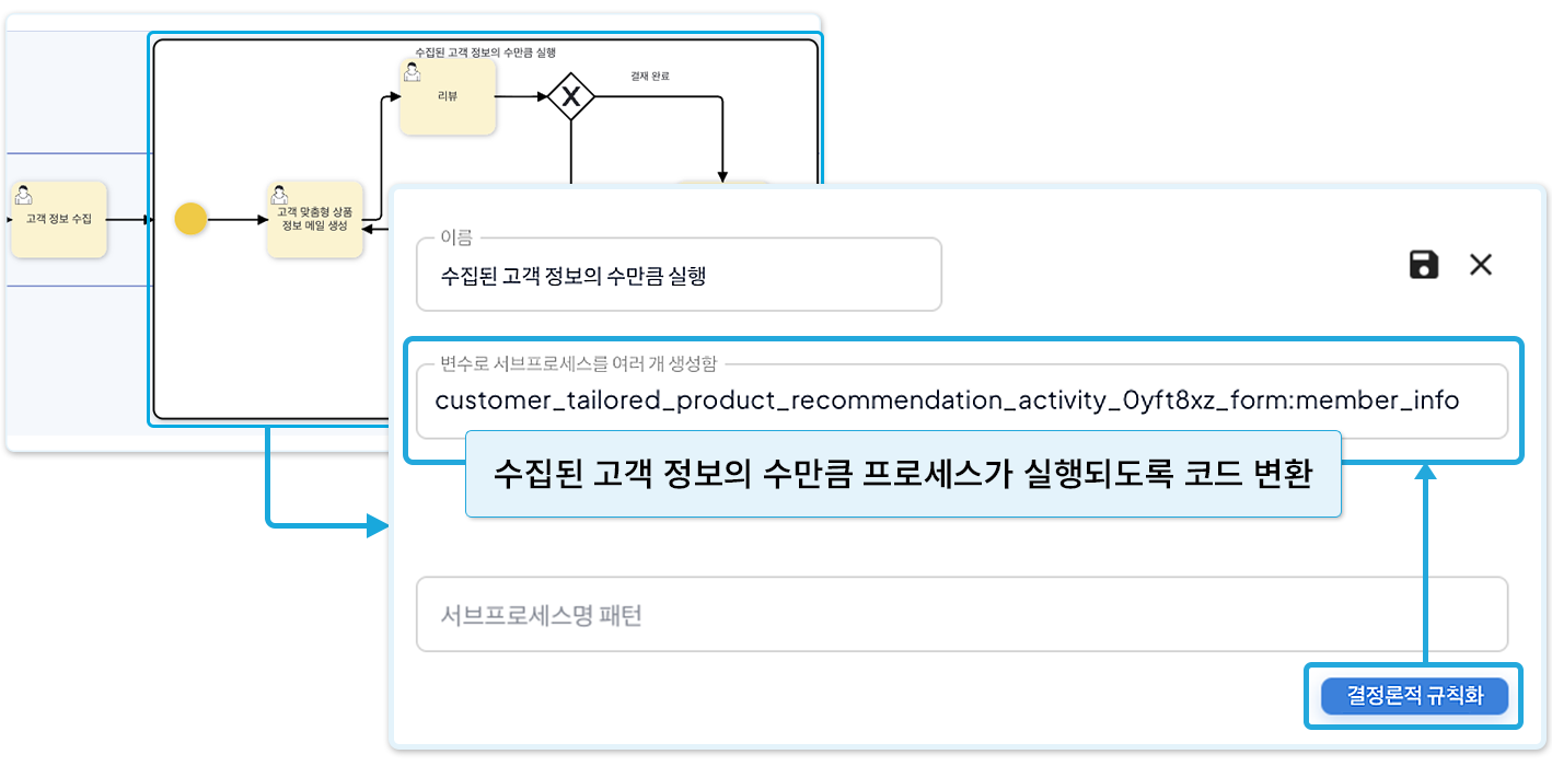 사용자는 BPMN 기반의 직관적인 UI에서 이전 단계 결과물 중 다음 단계로 전달할 항목을 선택하거나, LLM이 업무 프로세스 맥락을 분석해 자동으로 최적화하도록 설정함으로써 코드 없이도 연결성 있는 프로세스를 구성할 수 있습니다.